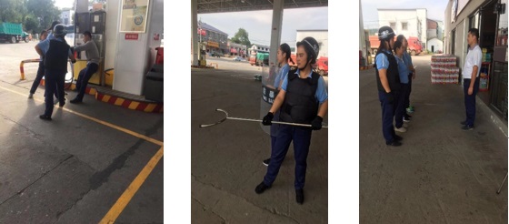 最終在大家的通力配合下,員工們成功將歹徒逼至加油站圍墻邊,并制服歹徒。演練結(jié)束后,站經(jīng)理彭甜甜對演練過程進行總結(jié)點評:站內(nèi)員工反應(yīng)迅速,配合密切,取得了此次反恐演練的預(yù)期效果。